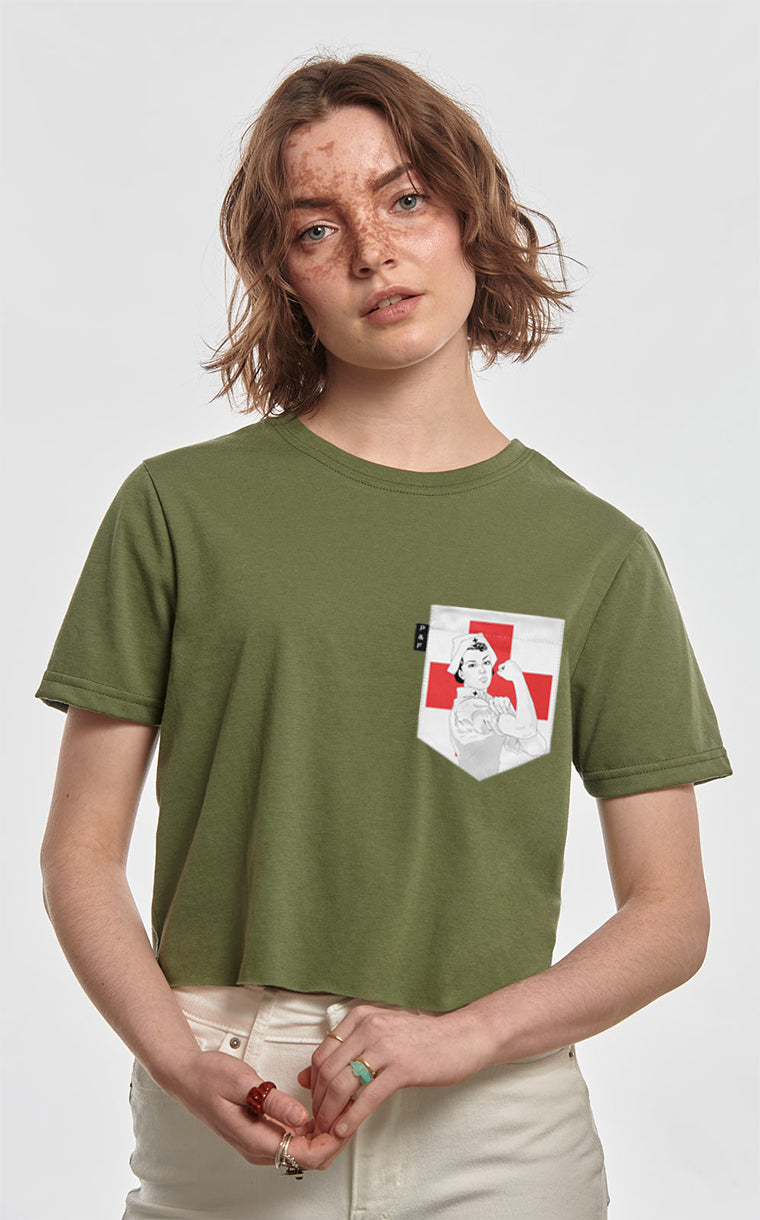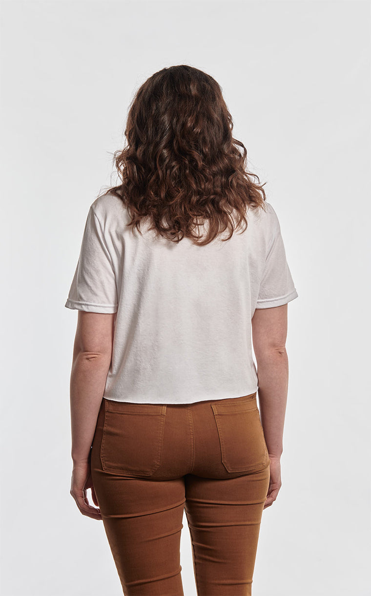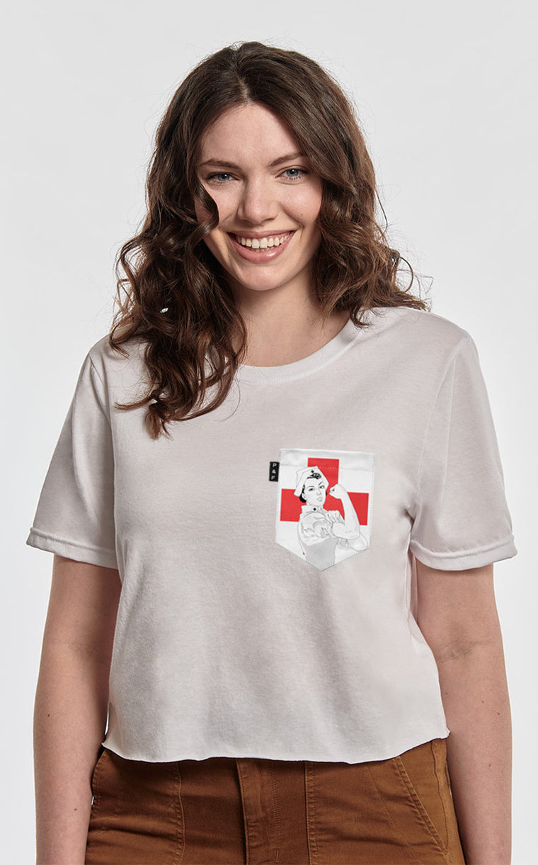 T-shirt « crop top » à poche pour femme. Pour les plus beaux nombrils. Bas du t-shirt coupé sans couture.