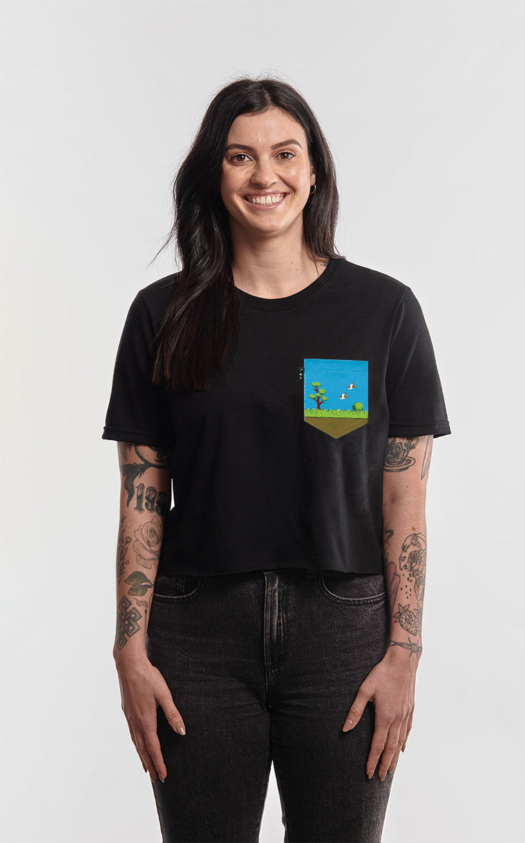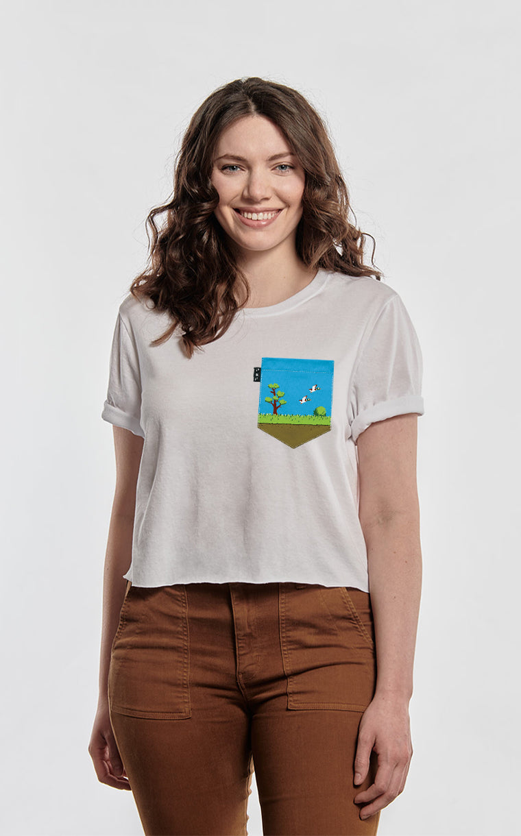 T-shirt « crop top » à poche pour femme. Pour les plus beaux nombrils. Bas du t-shirt coupé sans couture.